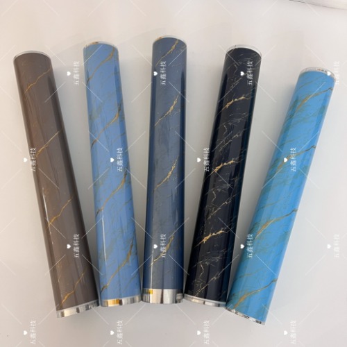 五鑫科技的热转印膜,以抽象水泥肌理为核心脉络,晕染出浅蓝调、米白、金棕、银灰等多样色调。这些纹理并非刻意雕琢的规整图案,而是带着随性的自然质感,像是水泥表层经时间沉淀出的肌理脉络,铺展在板材上时,能让原本单调的基材多了层松弛的艺术感,不会因纹理刻意而显得局促。