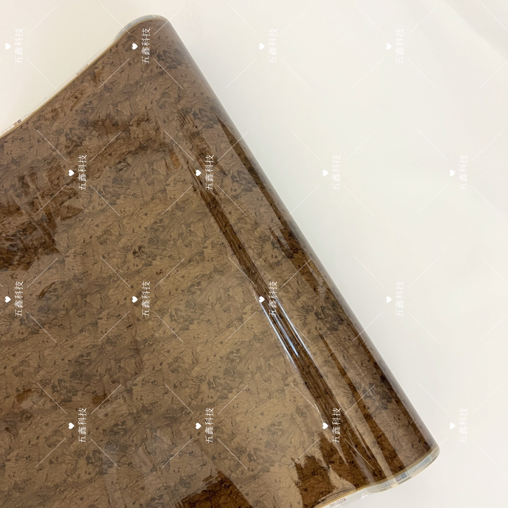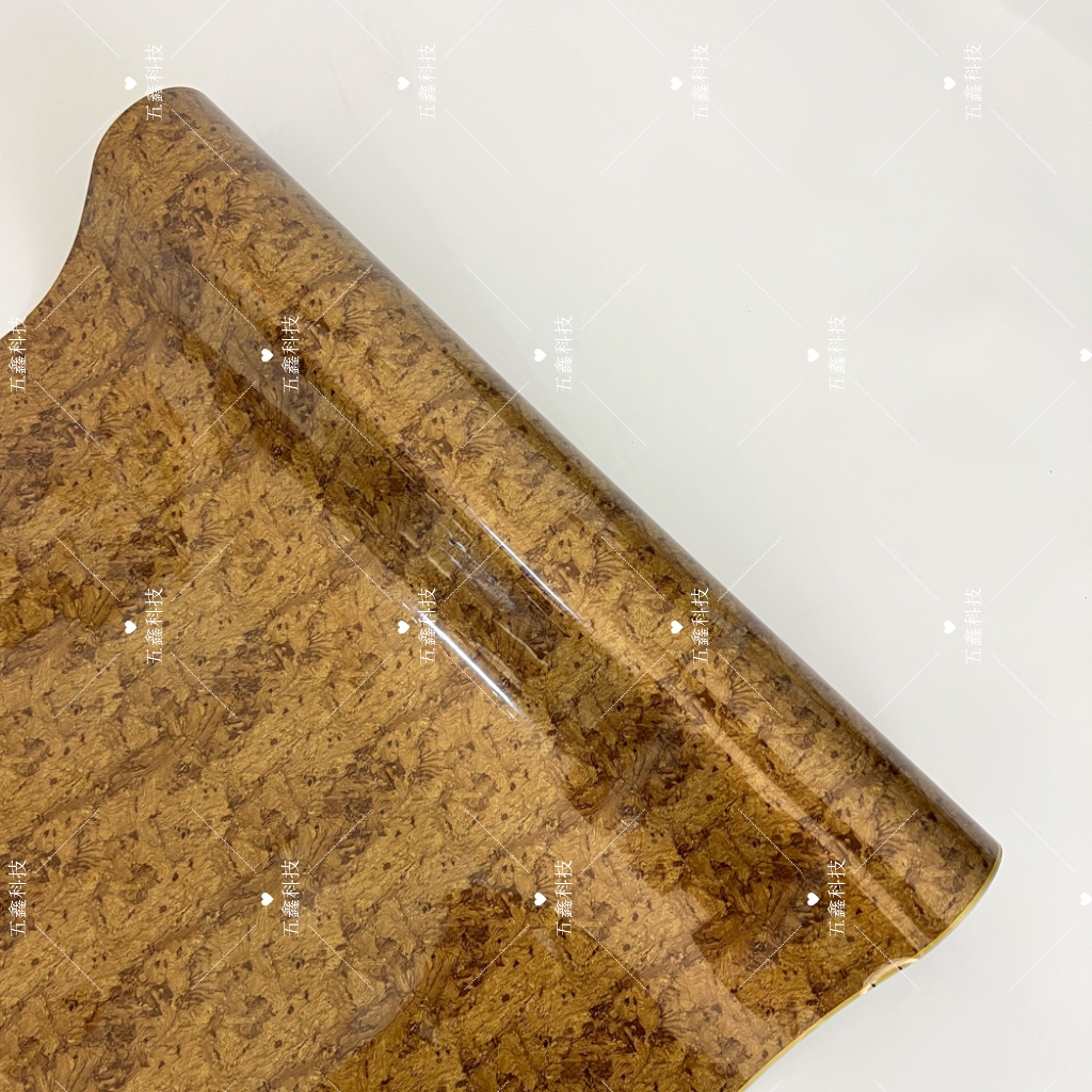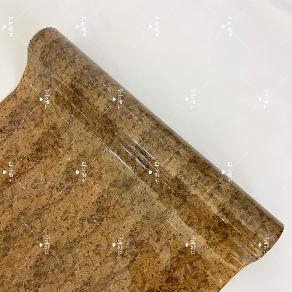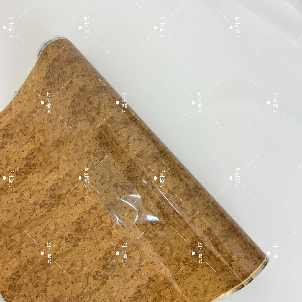 五鑫科技的天然软木肌理热转印膜,纹路还原天然软木的细密纤维纹理,分布自然斑驳,没有刻意的规整感,贴合后能呈现软木原生的温润肌理。颜色涵盖浅暖棕、中棕、深咖啡等不同棕系色调,适配多样装饰风格。它具备耐刮、耐水、耐晒的特性,日常使用不易留划痕、水渍,长期光照也不易褪色,可用于密度板家具面板、免漆门、工艺品等产品的表面装饰,让产品兼具自然质感与实用性能。