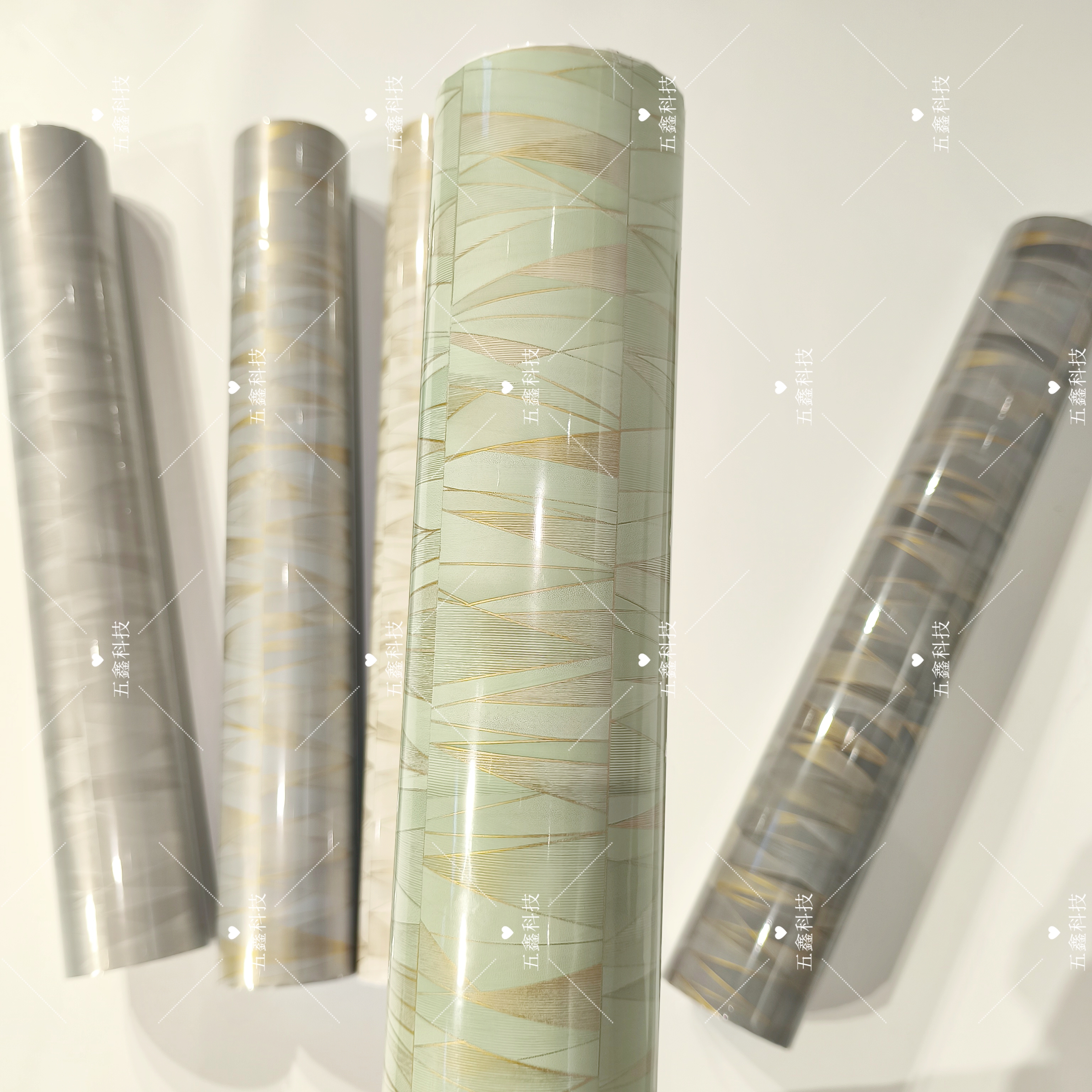 五鑫科技的金属几何拼接纹热转印膜,以交错的几何线条与细腻肌理呈现金属质感的拼接纹理,颜色包含浅绿、银灰、米白等多种色调。它具备耐刮、耐水、耐晒的特性,能适配PS、实木等材质,用于相框与装饰线条的表面装饰,为产品赋予兼具金属质感与几何设计感的视觉层次,让装饰效果更具风格。