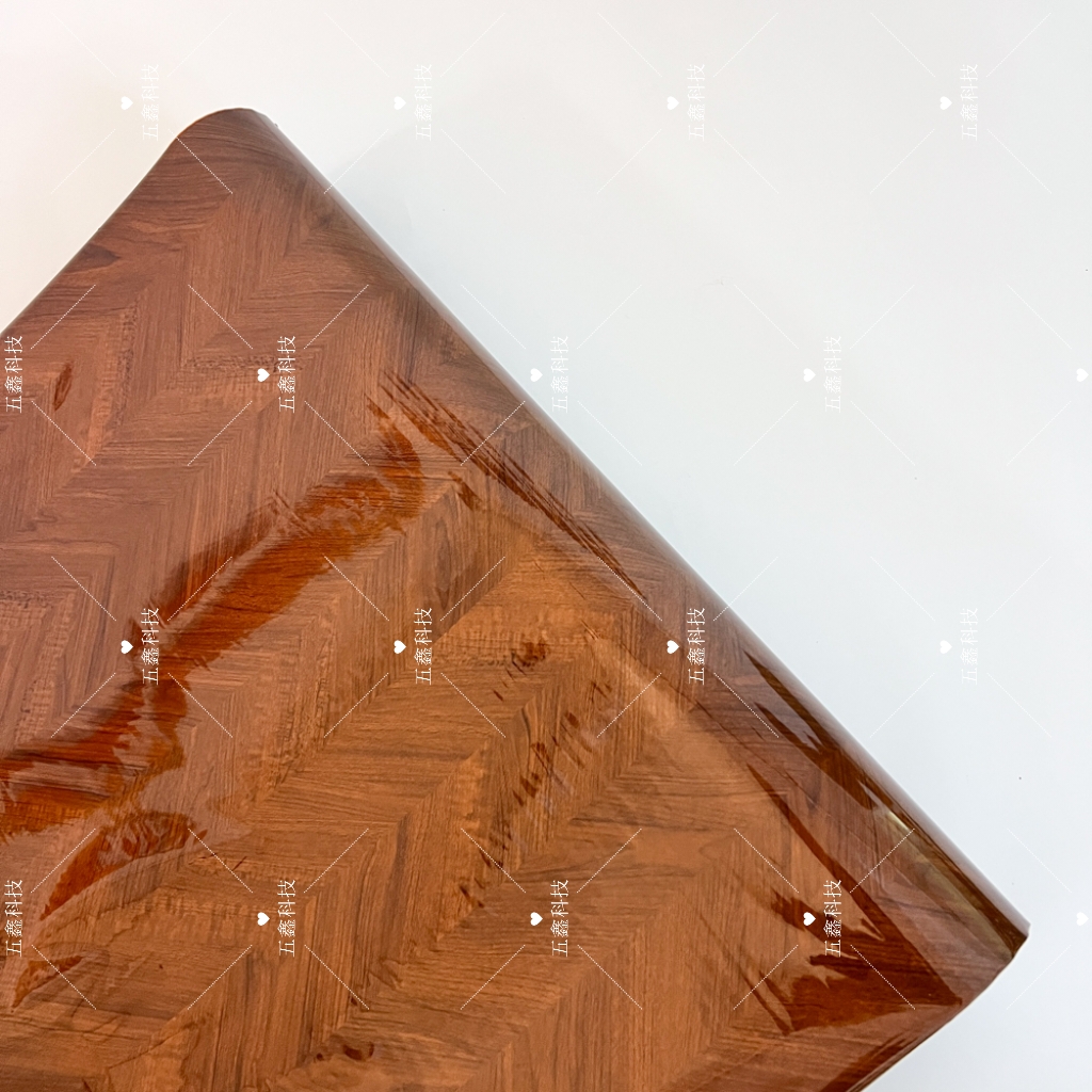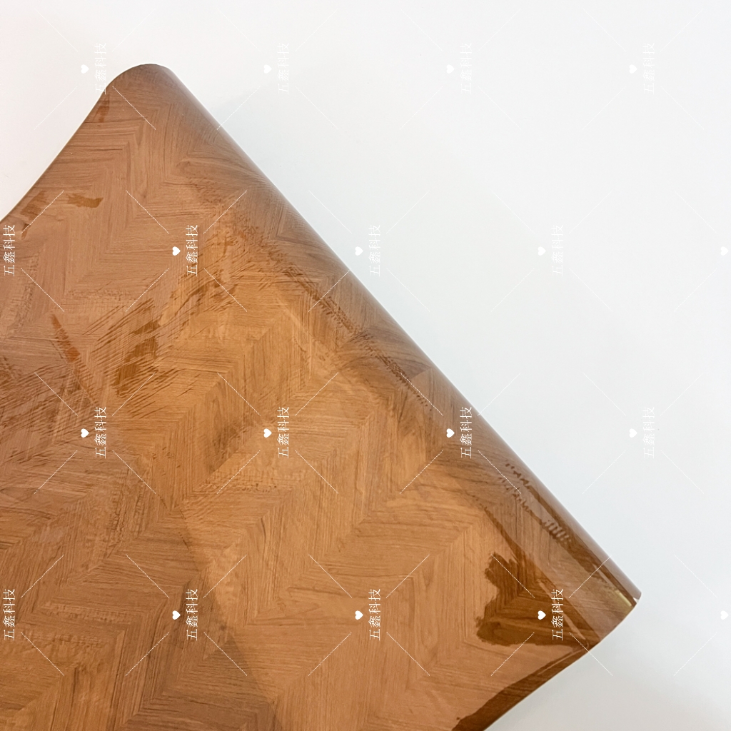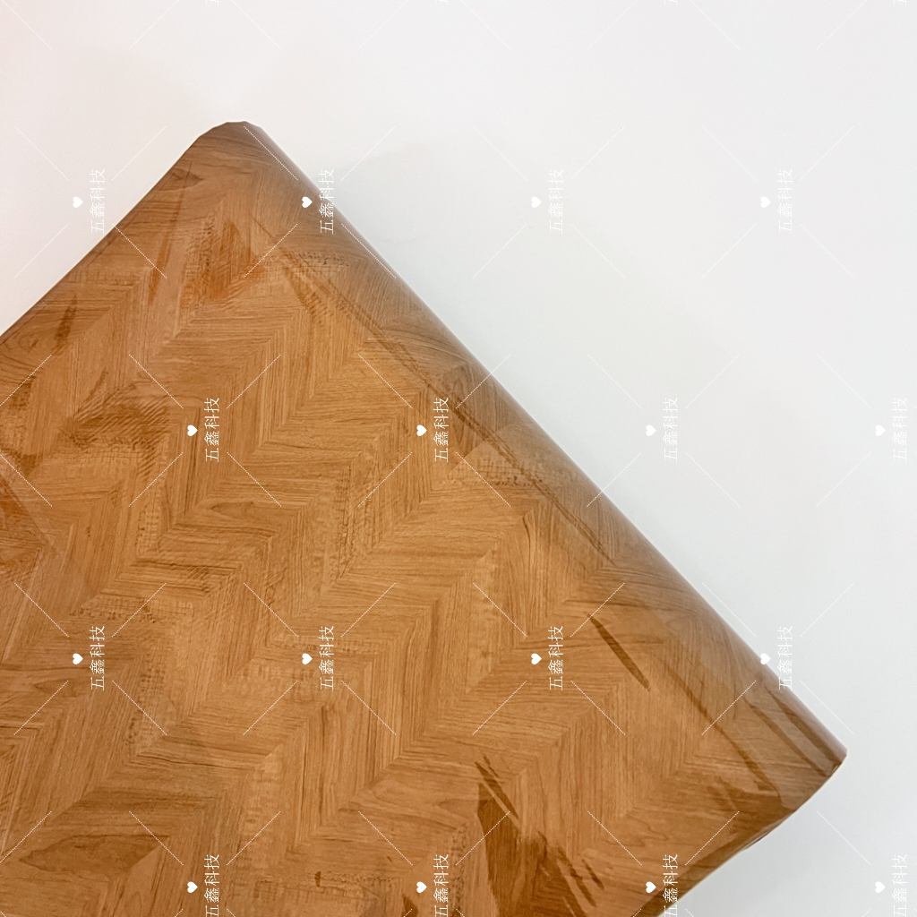 五鑫科技的人字木纹热转印膜使用时,直接将膜面贴合在PS或实木材质的相框、装饰线条待装饰表面,随后将贴合好膜材的基材放入热转印机,根据基材特性调节机器的温度与压力参数,待转印机完成热压工序后,揭下膜材的离型层,即可在基材表面形成完整的人字木纹装饰效果,操作操作流程简洁且贴合度高。