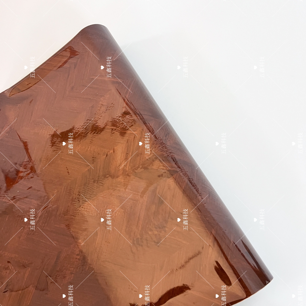 五鑫科技的人字木纹热转印膜,纹理呈现出规整的人字交错形态,纹路衔接自然且层次分明,勾勒出实木原纹的质感;色彩覆盖深褐、红棕、浅金等多款木质系色调,每一种色调都能贴合不同基材的装饰需求。这款膜材兼具耐刮、耐水、耐晒的特性,适配PS与实木材质的相框、装饰线条表面装饰,转印后能紧密贴合基材表面,让相框与装饰线条的表面质感更显自然细腻。