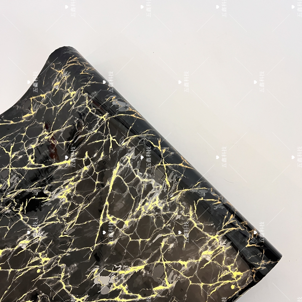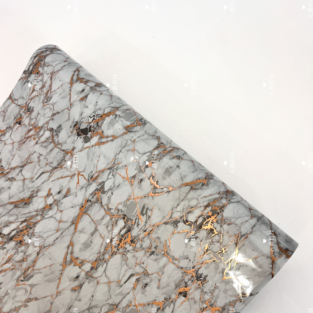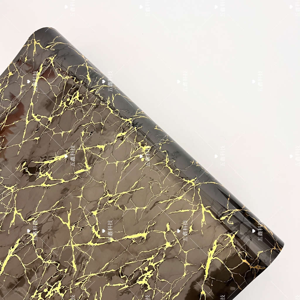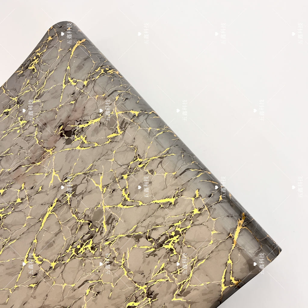 使用五鑫科技仿玛瑙金纹热转印膜时,在热转印机上固定好热转印膜后,直接将膜完整覆在PS或PVC材质装饰板表面,对齐定位后启动热转印机,待设备完成转印流程揭下底膜,装饰板表面便会呈现出完整连贯的玛瑙金纹肌理,操作便捷且能保留纹路的自然流畅感。