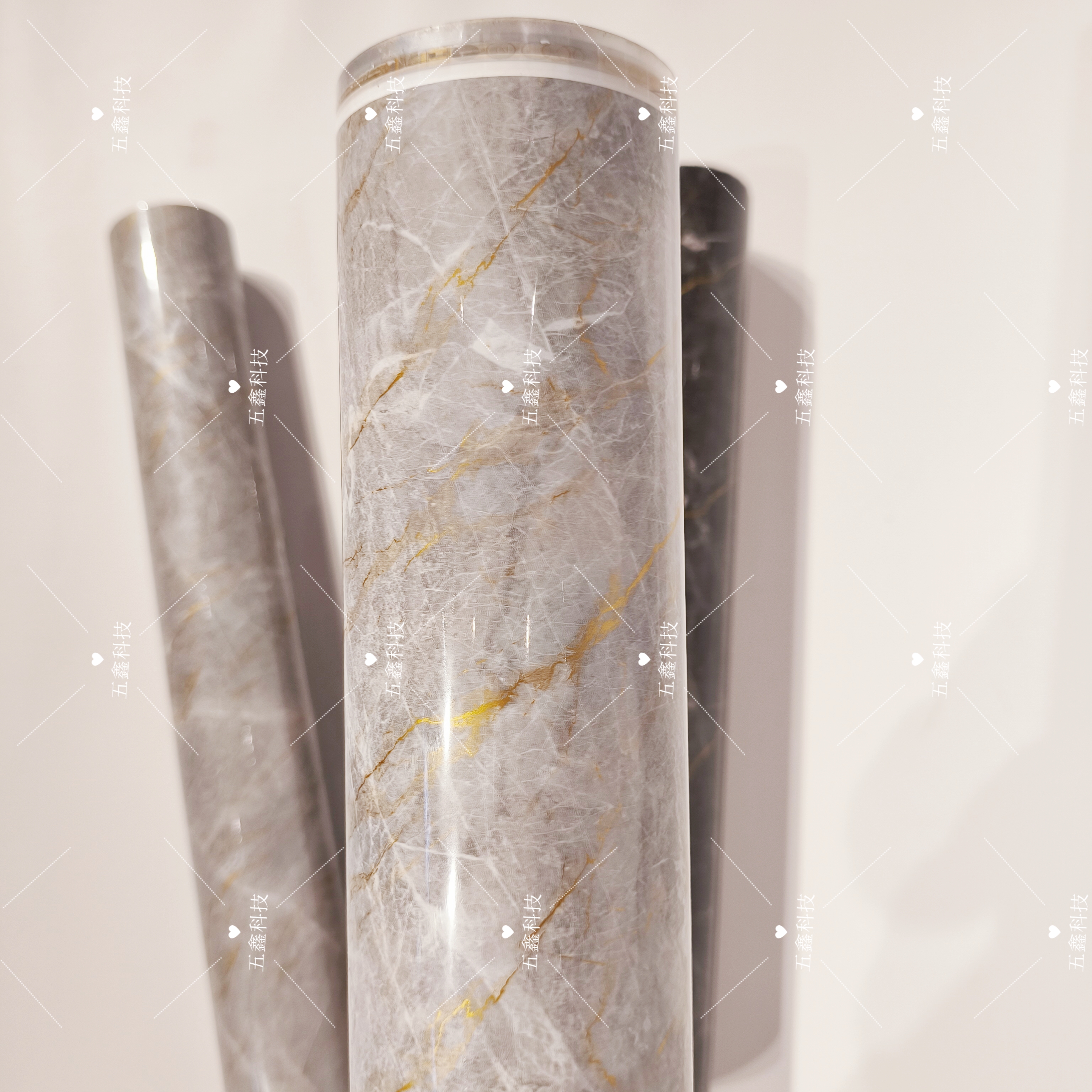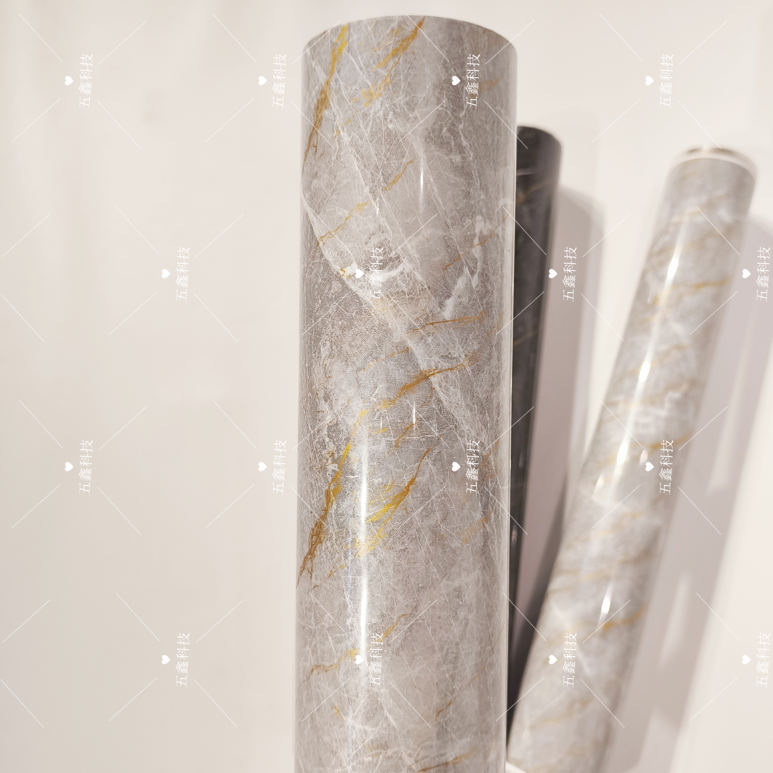 将五鑫科技金丝灰大理石纹热转印膜平整铺于户外家具、墙板、百叶窗等基材表面,无需裁剪,直接通过热转印机施加合适温度与压力,使膜层与基材紧密贴合,完成转印后,便能呈现出带有金丝纹理的大理石质感装饰面,操作便捷高效。